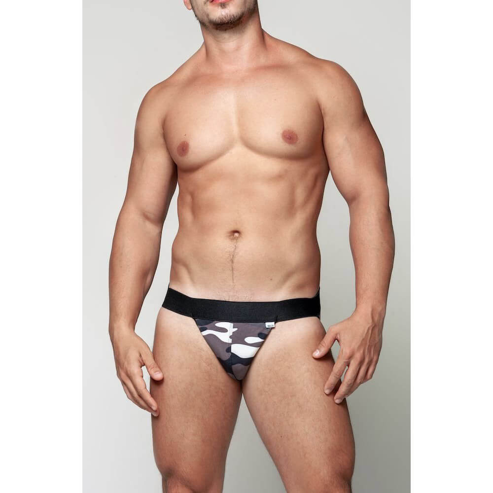 Cueca jockstrap, feita em poliéster e elastano no tamanho único com estampa camuflada, abertura traseira e alças inferiores na região das nádegas.
