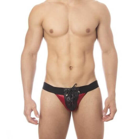 Cueca jockstrap toda confeccionada em cirrê com nádegas totalmente abertas e com detalhes em ilhós com laço e elástico confortável na cintura. Chega mais!
