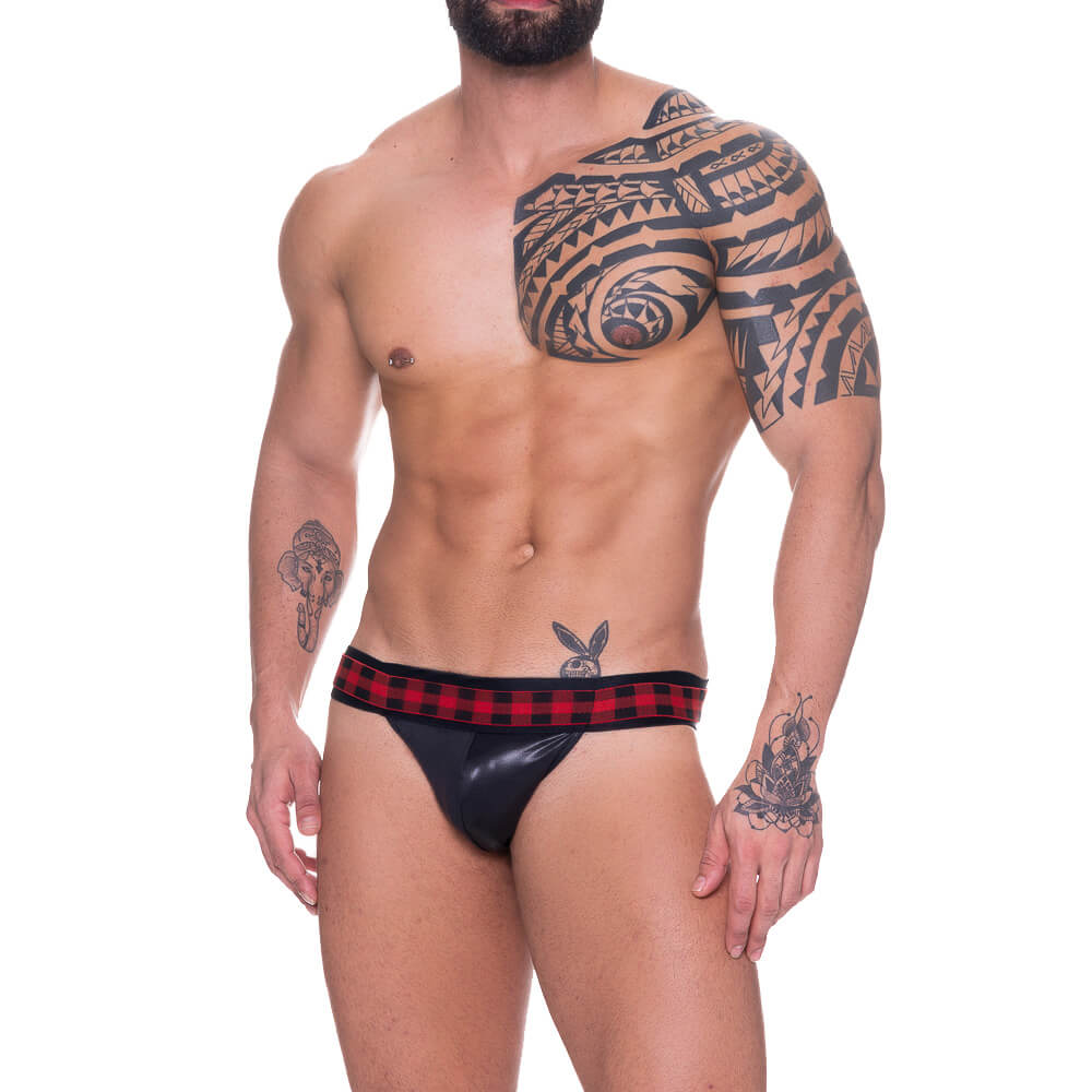 Cueca feita em cirrê com abertura nas nádegas e elástico personalizados com estampas xadrez na cintura. Perfeito para apimentar o relacionamento.