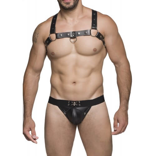 Jockstrap com tapa sexo trançado e pingente de caveira costurada no elástico.