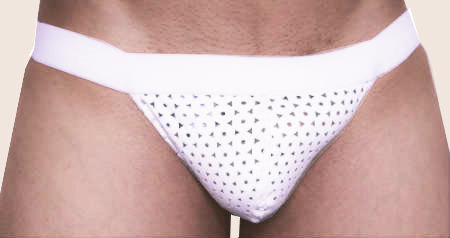 Cueca tapa sexo em courino na cor branca, completamente vazada, com abertura nas nágedas. Tamanho Único (Veste do 34 ao 42).