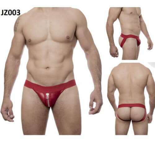 Cueca tapa sexo em couro sintético vermelho com detalhe de zíper. Aproveite!