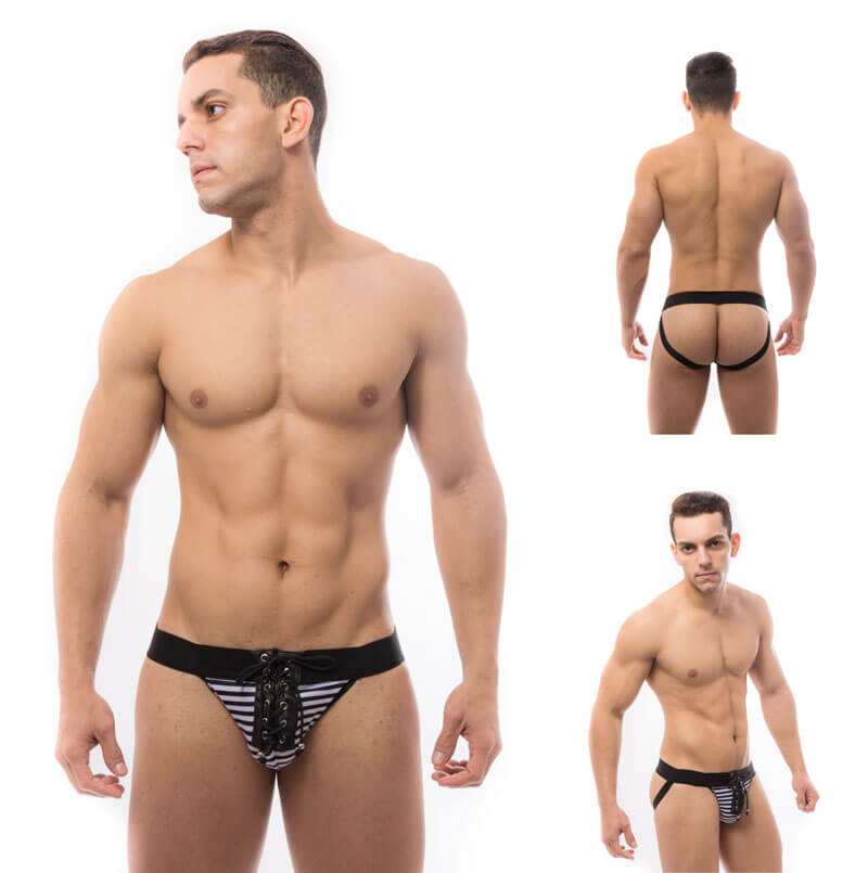 É uma cueca tapa sexo listrada em preto e branco com detalhe de amarrar na frente e abertura na parte de traz. Tamanho Único.