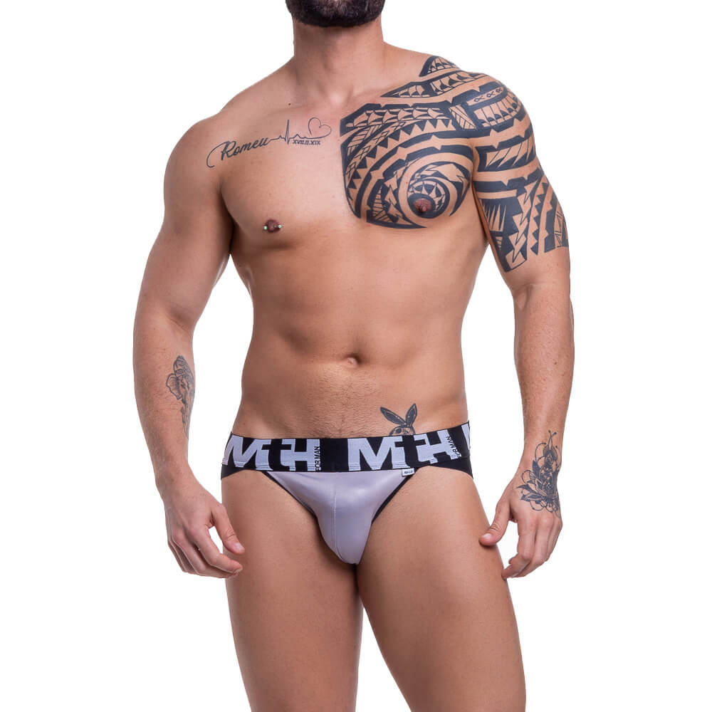 Cueca sunga feita em tecido cirrê confortável, com elásticos nas nádegas e elástico estampado na cintura.