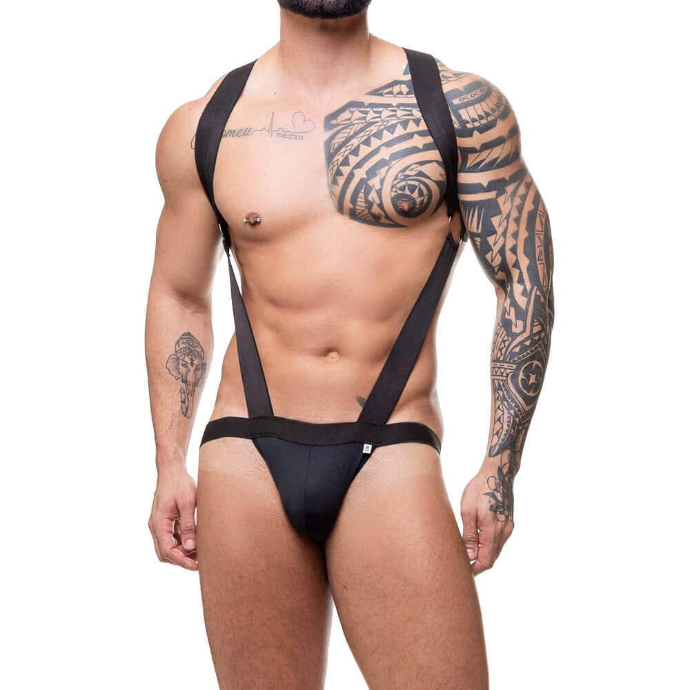 Cueca harness, feita em suplex preto no tamanho único, interligada por argolas em metal leve á um suspensório cruzado com abertura na região das nádegas.