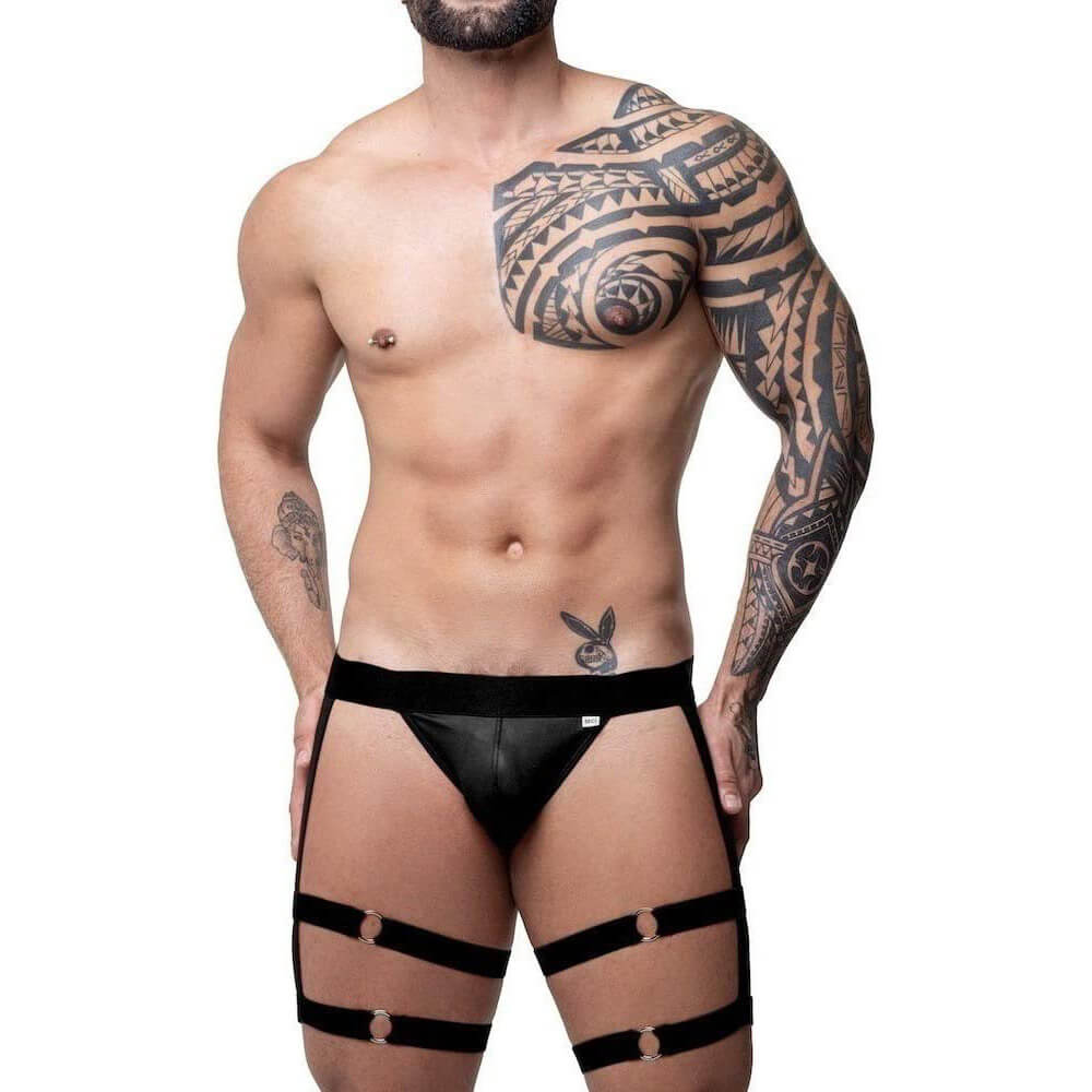Cueca masculina, no modelo jockstrap com abertura traseira na região das nádegas com ligas para as coxas em elastano, argolas em metal, no tamanho único.