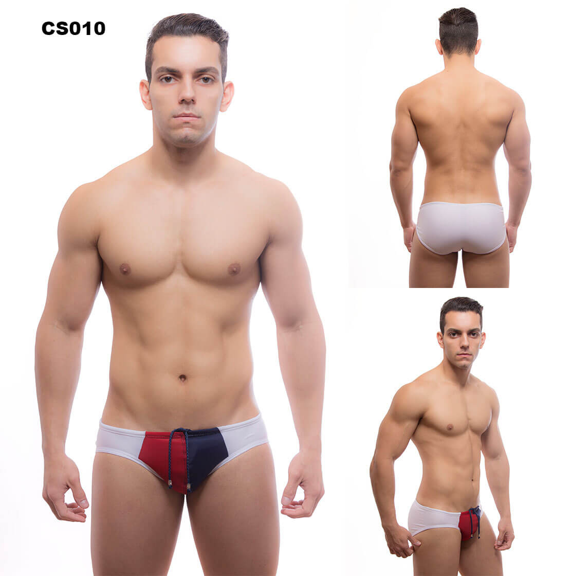 Cueca estilo sunga com cordão que auxilia no ajuste da cintura na cor branca com detalhe azul marinho e vermelho.