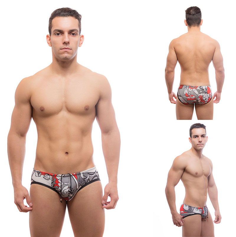 Sunga com estampa que lembra uma história em quadrinhos, perfeita para ser utilizada em hidros e piscinas.