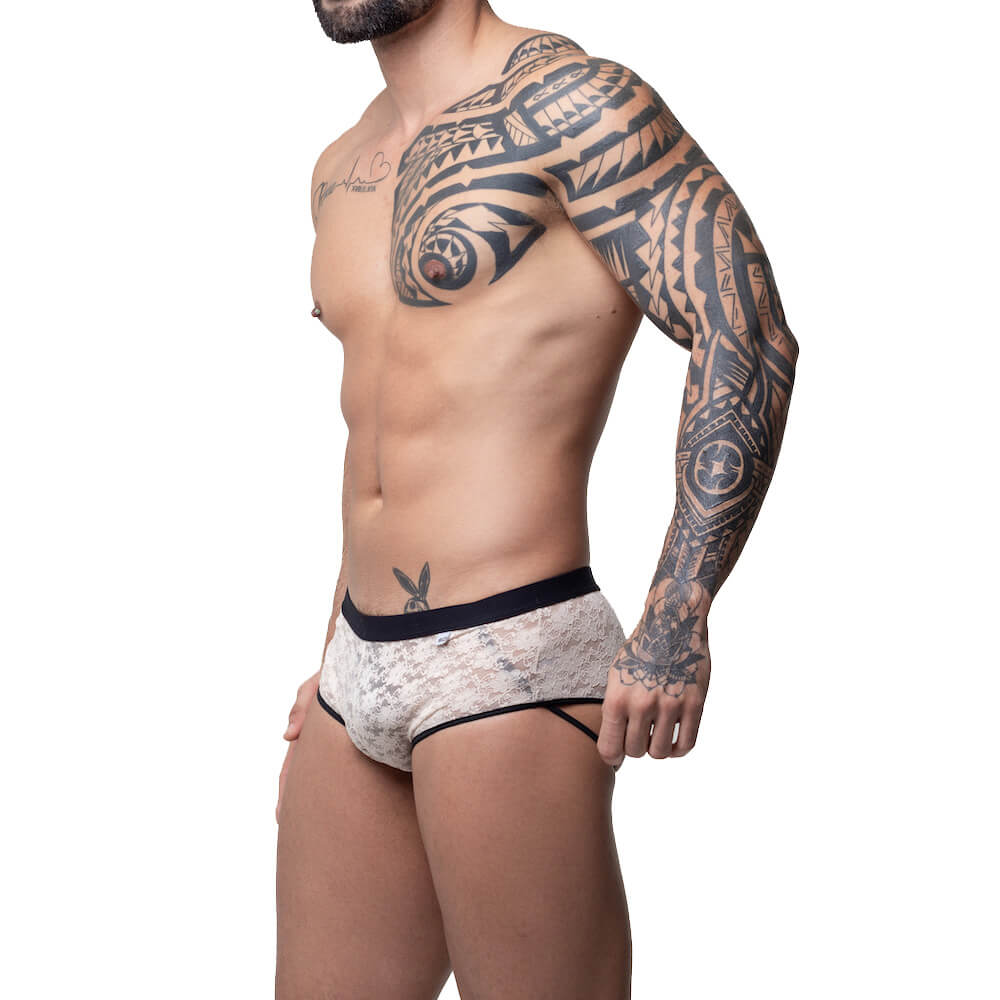 Sunga feita em tecido rendado com tiras elásticas atrás e transparência para te deixar mais sensual. Chega mais!
