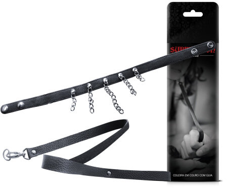 Coleira ajustável em couro sintético com correntes de metal e guia . É ideal para fantasias de submissão e entrega, é afivelada e possui guia para passeios e comandos.