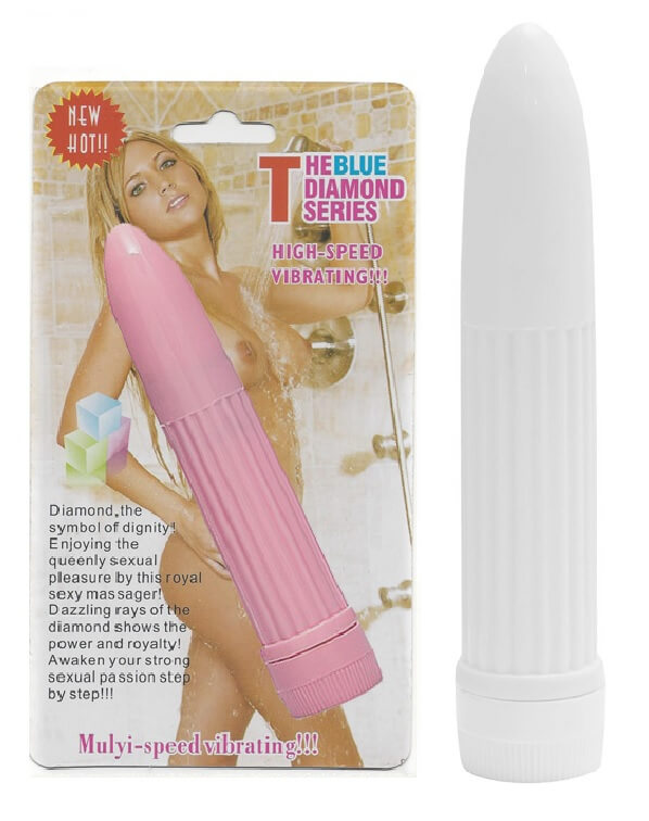 Vibrador personal com textura estriada em relevo e vibração multivelocidade controlada a partir de um botão giratório em sua base.