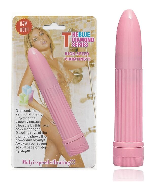 Vibrador personal com textura estriada em relevo e vibração multivelocidade controlada a partir de um botão giratório em sua base.
