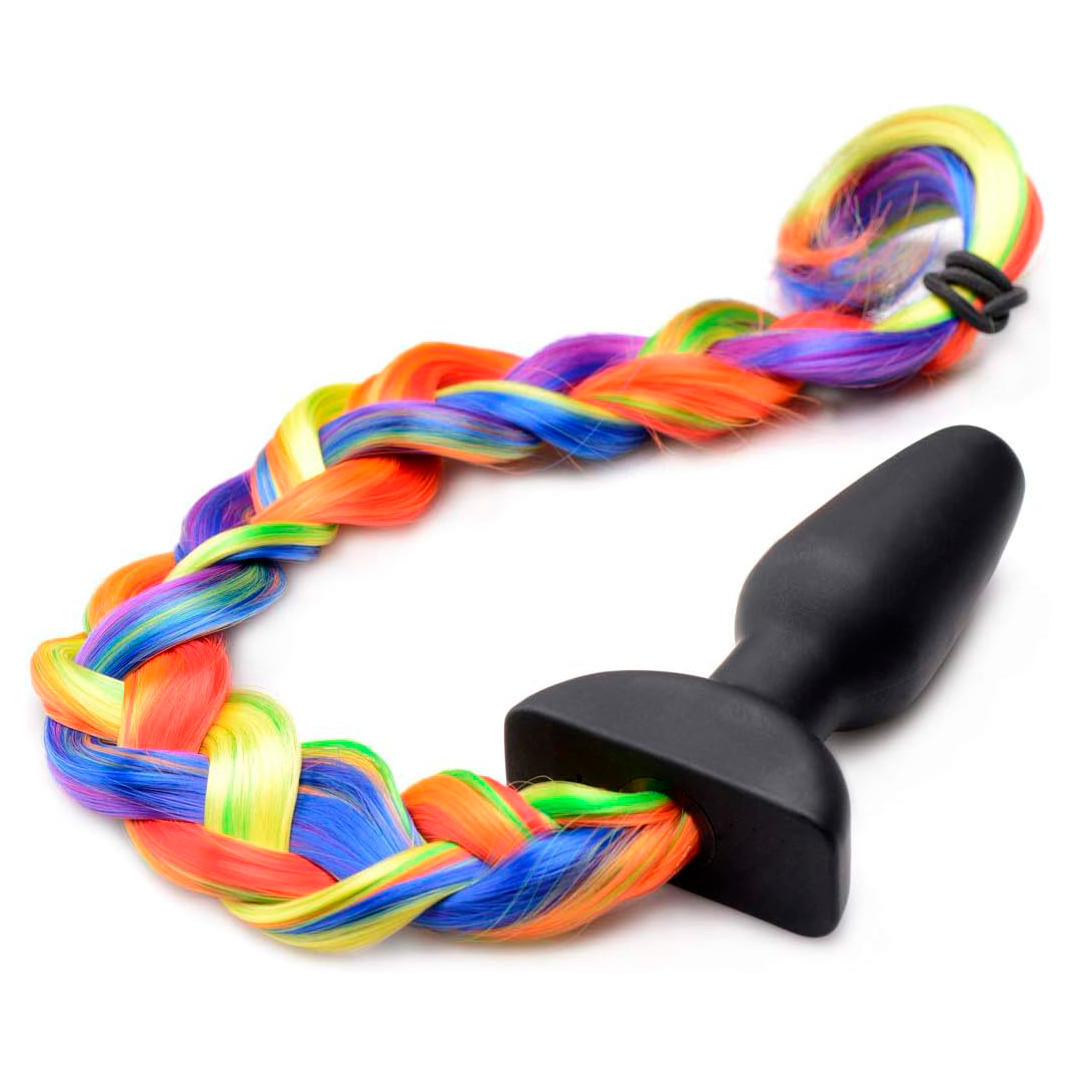 Plug anal cônico todo confeccionado em silicone com base de segurança e cauda colorida de material sintético em arco-íris. Role a página para saber mais!