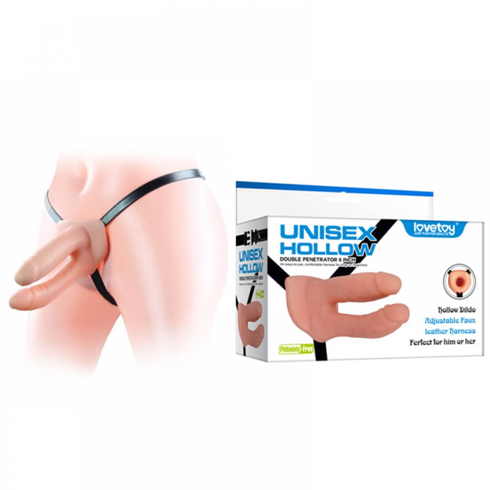 Cinta unissex para dupla penetração, possui pênis oco que pode ser usado como capa peniana, confeccionado em TPE com glande definida e veias salientes.