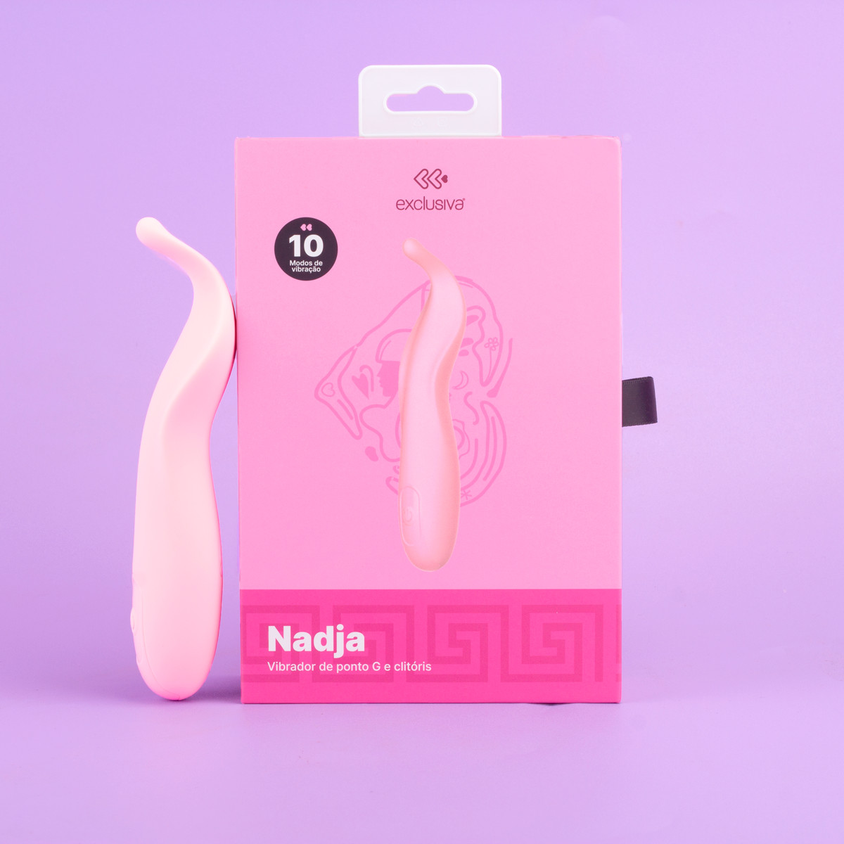 Sinta o prazer infinito com o estimulador de ponto G e clitóris Exclusiva Nadja, feito em silicone macio e equipado com 10 modos de vibração. Ele é perfeito para intensificar suas experiências de prazer, seja sozinha ou acompanhada!