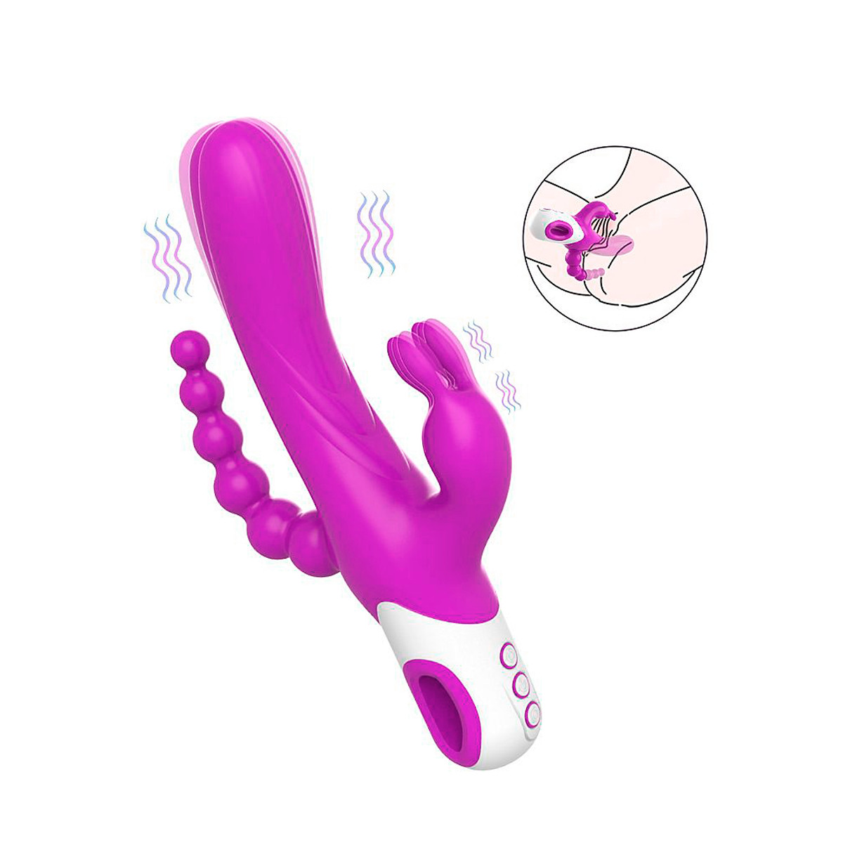 Vibrador rabbit em silicone com plug anal escalonado e 15 modos de vibração intensas. Com 2 motores para controle independente dos estimuladores, recarregável e resistente à água. Chega mais e confira os detalhes!