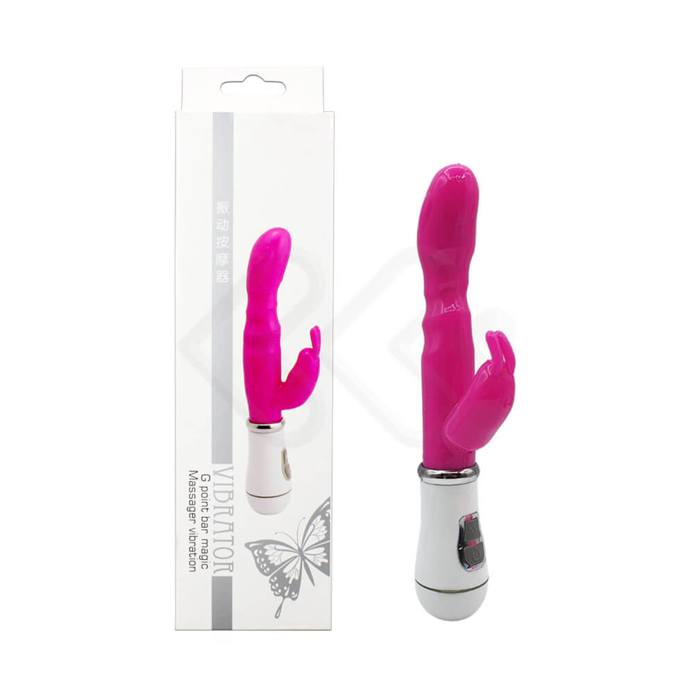 Vibrador de ponto G com estimulador de clitóris no formato de coelho, feito em silicone e ABS atóxico com 12 modos de vibração, corpo escalonado e texturas laterais.