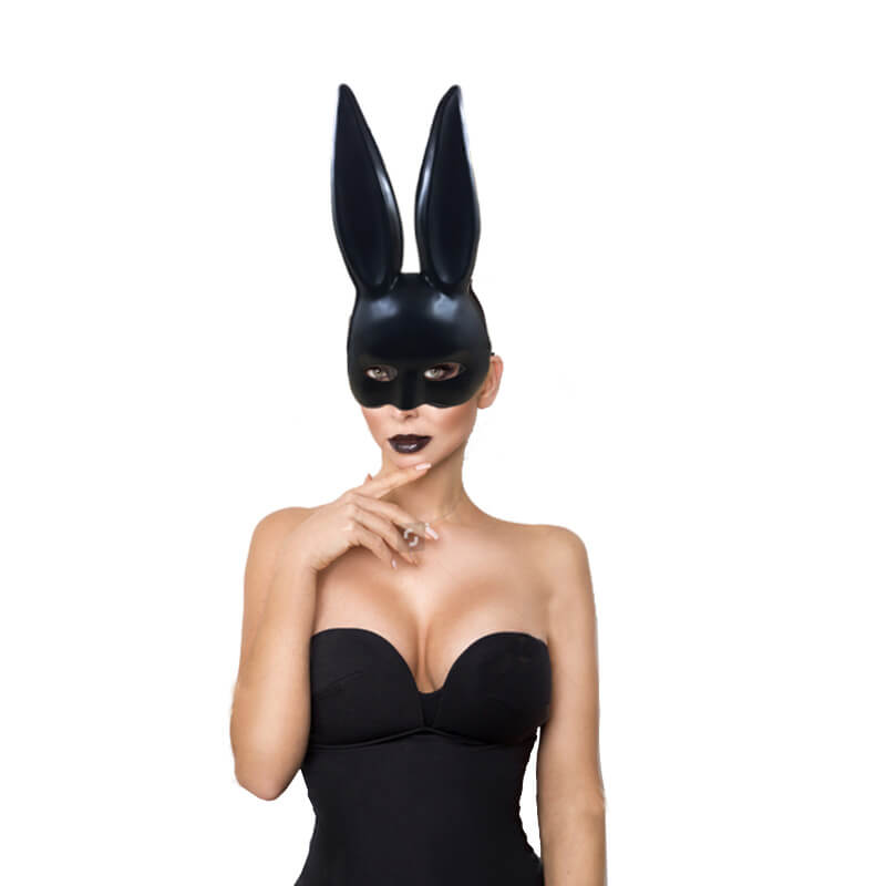 Mascara para fantasia com orelhas de coelho que cobre metade do rosto.