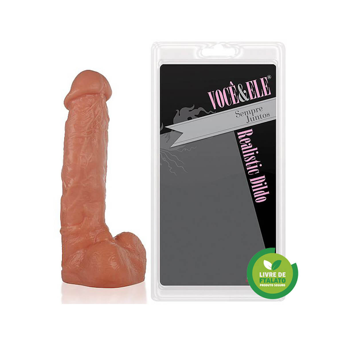 Prótese peniana "Urano" em silicone com glande definida, veias salientes e escroto, possui base achatada oque permite fazer o uso da prótese com ou sem as mãos.