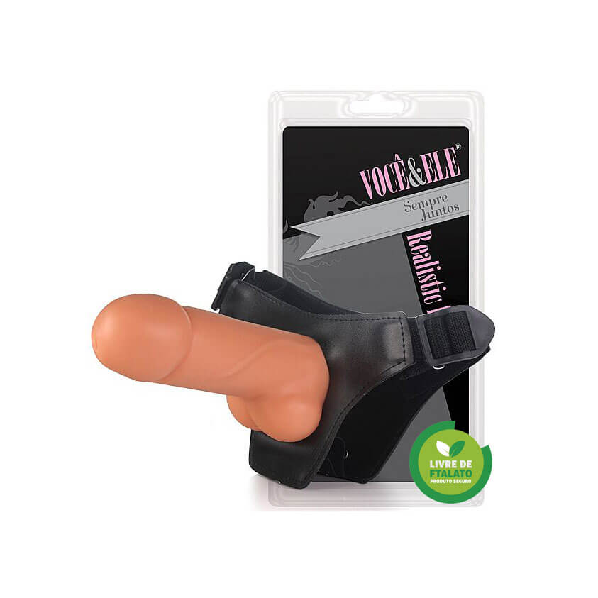 Cinta em couro sintético com prótese Vader em forma de pênis realista curvado com glande definida, saliência de veias ao longo do corpo e escroto.