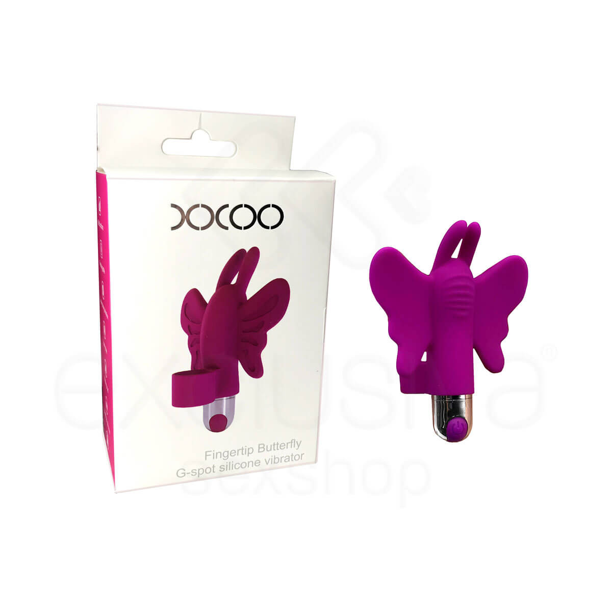 Dedeira feita em silicone atóxico de toque aveludado com formato de borboleta e suporte para dedo. Possui 10 modos de vibração com carregamento via USB.