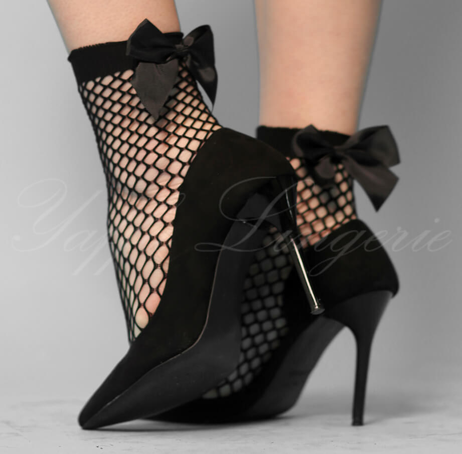 Meia arrastão com espaço grande, cano médio e detalhe de laço na parte traseira. Não deixe de experimentar!