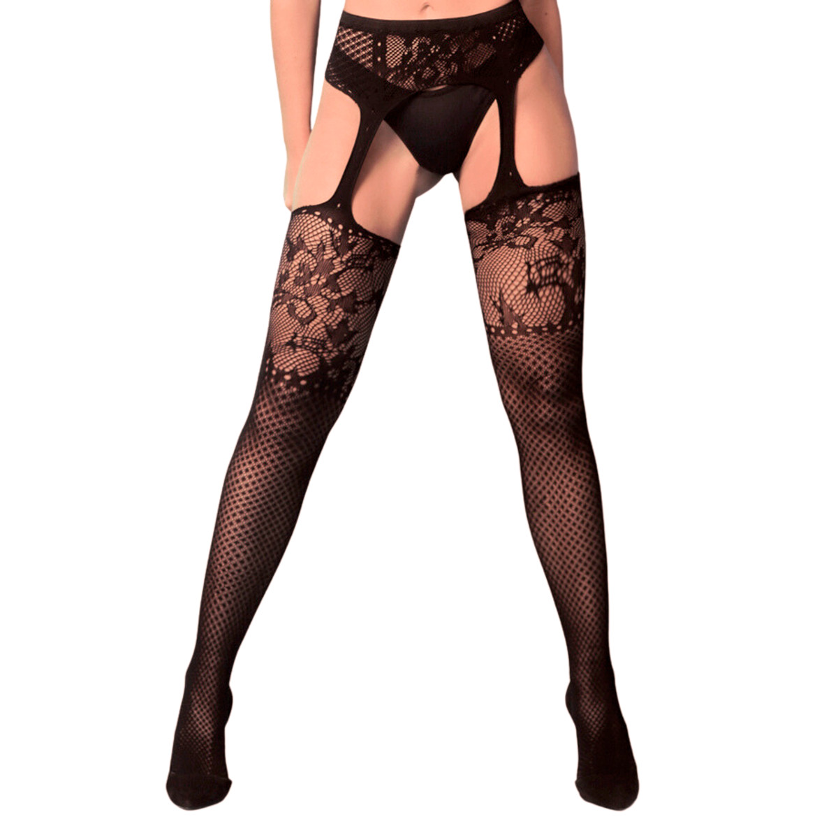 Meia calça arrastão 7/8 com cinta-liga integrada na peça e detalhes de renda com desenho floral na parte superior da meia. Adicione no guarda-roupa e explore as possibilidade de looks arrasadores!
