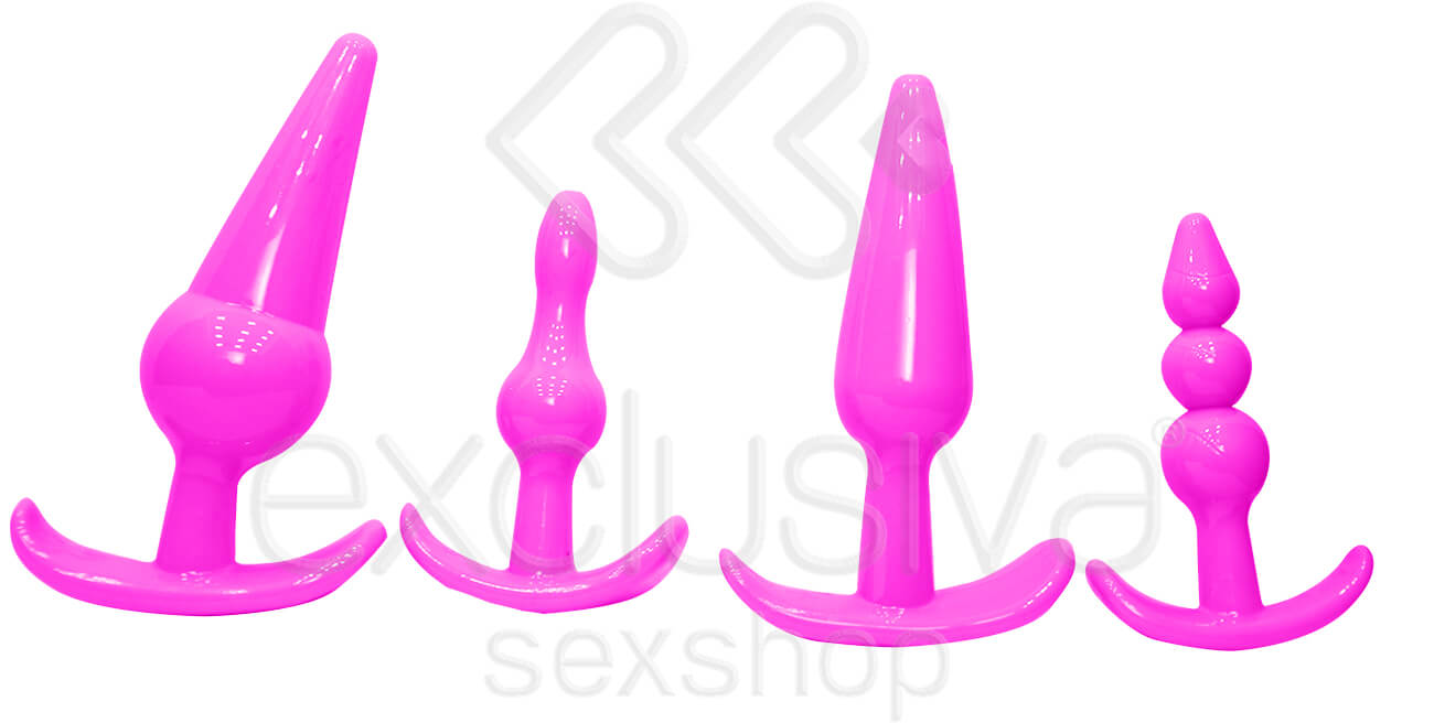 Kit com 4 plugs anais em diferentes tamanhos e formas. Neste kit possui um plug com esferas gradativas, um plug com duas esferas, um plug em formato cônico e um plug em formato cônico com uma esfera maior na parte inferior. Todos os plugs são feitos em silicone puro de alta qualidade. Perfeito para diversificar e aumentar seus momentos de prazer.
