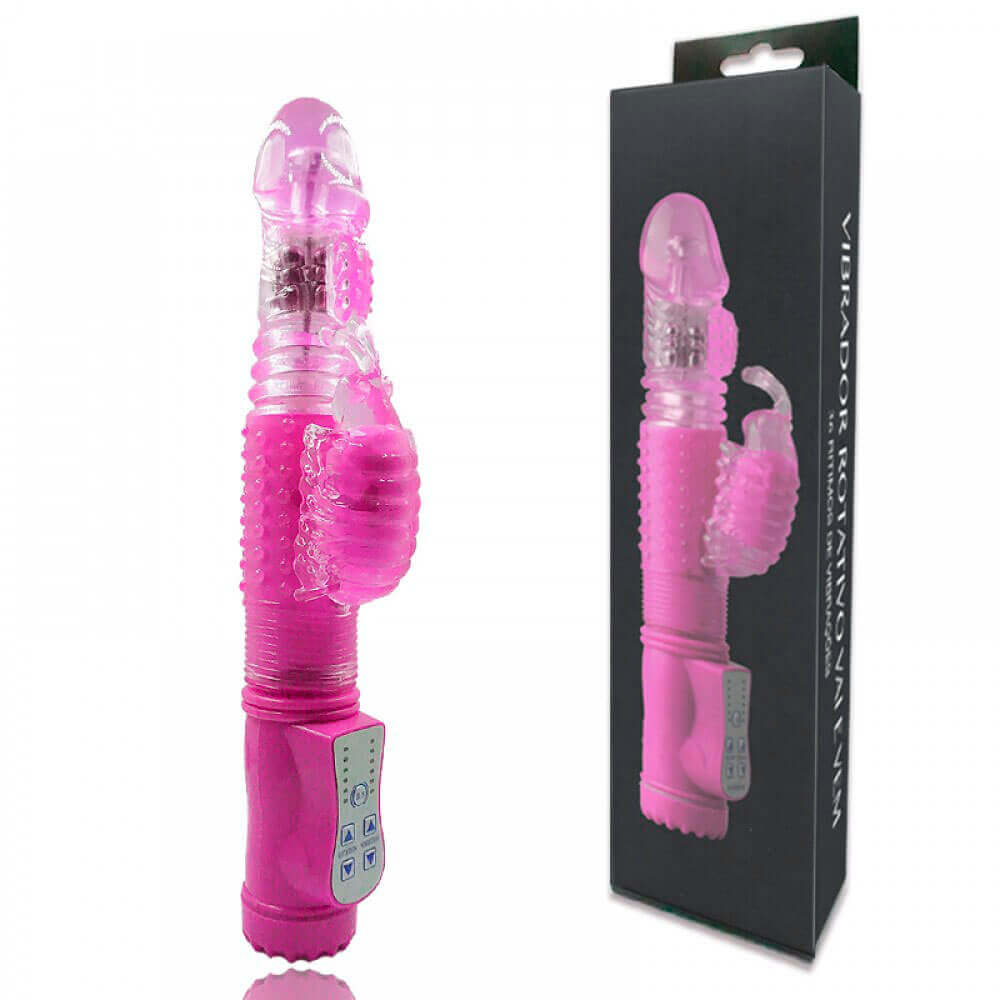 Vibrador rotativo com estimulador de clítoris que possui forma de borboleta, 36 modos de vibrações e modos de rotação. Confeccionado em silicone macio.